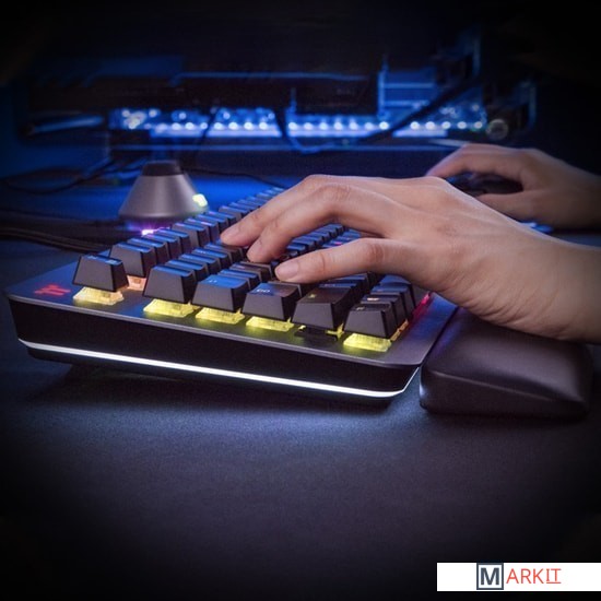Игровая клавиатура с алюминиевым топкейсом и круговой RGB подсветкой в нижней части, создающей неповторимы ореол.