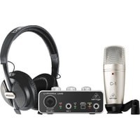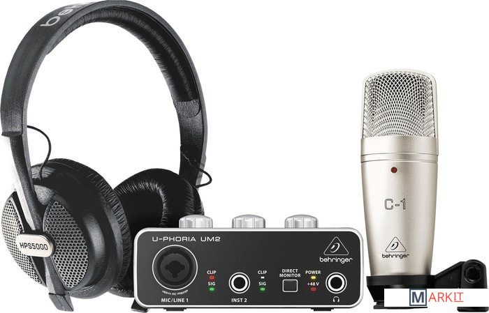 - аудиоинтерфейс Behringer U-Phoria UM2- мониторные наушники Behringer HPS5000- конденсаторный микрофон Behringer C-1- держатель для микрофона- аудиокабель для микрофона- кабель USB Type-B - USB Type-A- документация |