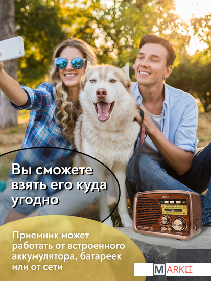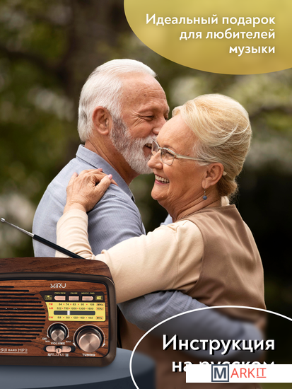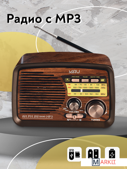 Радиоприемник MIRU SR-1027 коричневого цвета имеет ретро дизайн, простой функционал и обеспечивает приём сигналов в диапазоне FM, AM и SW. Аналоговый способ настройки частоты предполагает более точное и быстрое улавливание нужного канала. Для улучшения качества сигнала у радиоприемника имеется поворотная телескопическая антенна. Радиоприемник SR-1027 может работать как от сети 220В и аккумулятора, так и от двух батареек типа R20(D). Органы регулировки громкость и смена диапазонов расположены на передней панели приемника. Также предусмотрено проигрывание с USB и microSD накопителей. Данный радиоприемник отлично подойдет для туристов, дачников и просто любителей отдыха на природе.